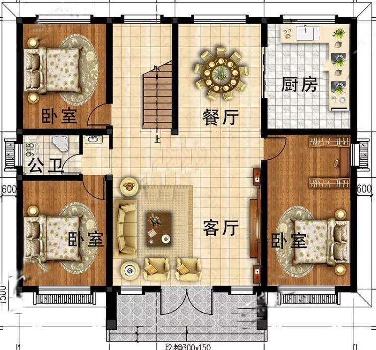 一層的戶型設(shè)計方正規(guī)矩,進門設(shè)計為客廳,面積適中,接待客人絲毫不顯擁擠。且設(shè)計了三間臥室,適合多口之家,搭配廚房餐廳,一樓設(shè)計空間利用很合理。