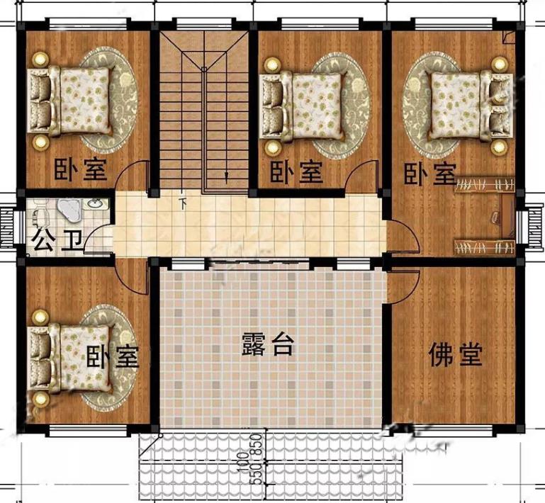 這個四川輕鋼別墅的二樓,不僅設(shè)計了四個臥室,還特意留有一個佛堂,也可以作為其他功能區(qū)域使用,更值得一提的是建筑的中間位置有一個大露臺,及隱私,有采光好,可以晾曬衣服和休閑。